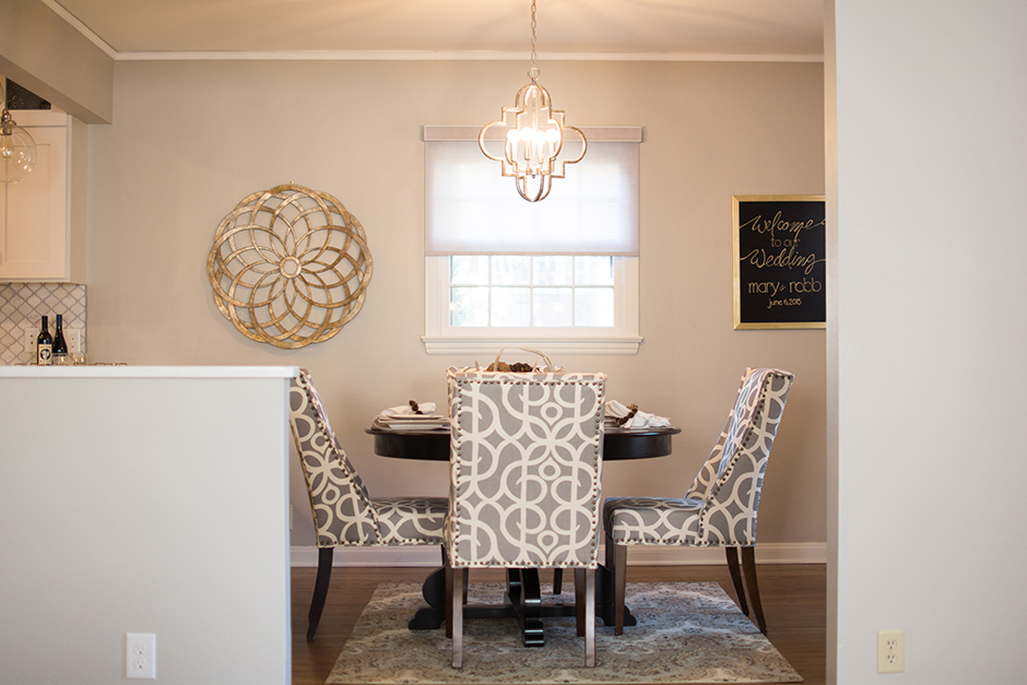 When one steps inside now, they are greeted with a contemporary living space in harmony with the home’s historic character. To the left is a living room with a grey sofa and chairs, which the couple custom designed with Montgomery’s Furniture. The end tables, along with the round dining table are from Pier One. In the dining room to the right of the entryway, a curved metal pendant light fixture hangs above the table, surrounded by chairs upholstered in a grey and white fabric with a design reminiscent of intertwined treble clefs.