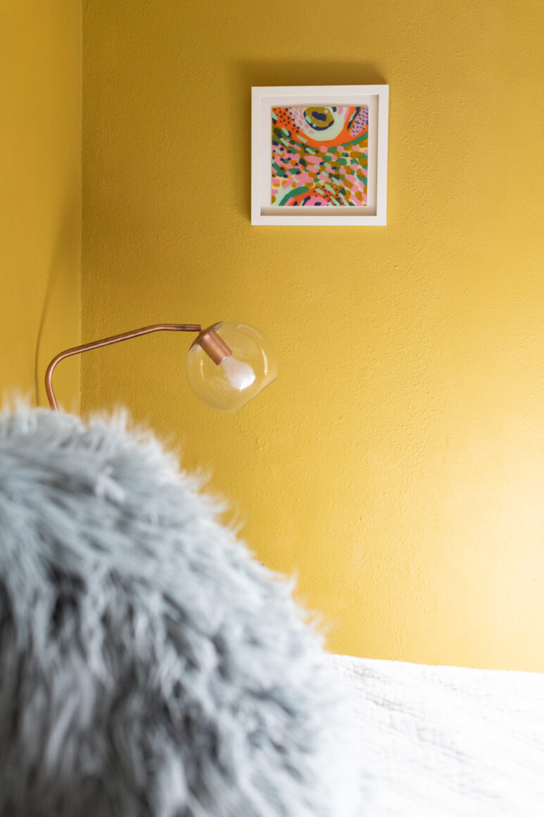 The bed sits between two bedside lamps, both found at Target, and is beneath another piece of artwork, this one more on the nose.