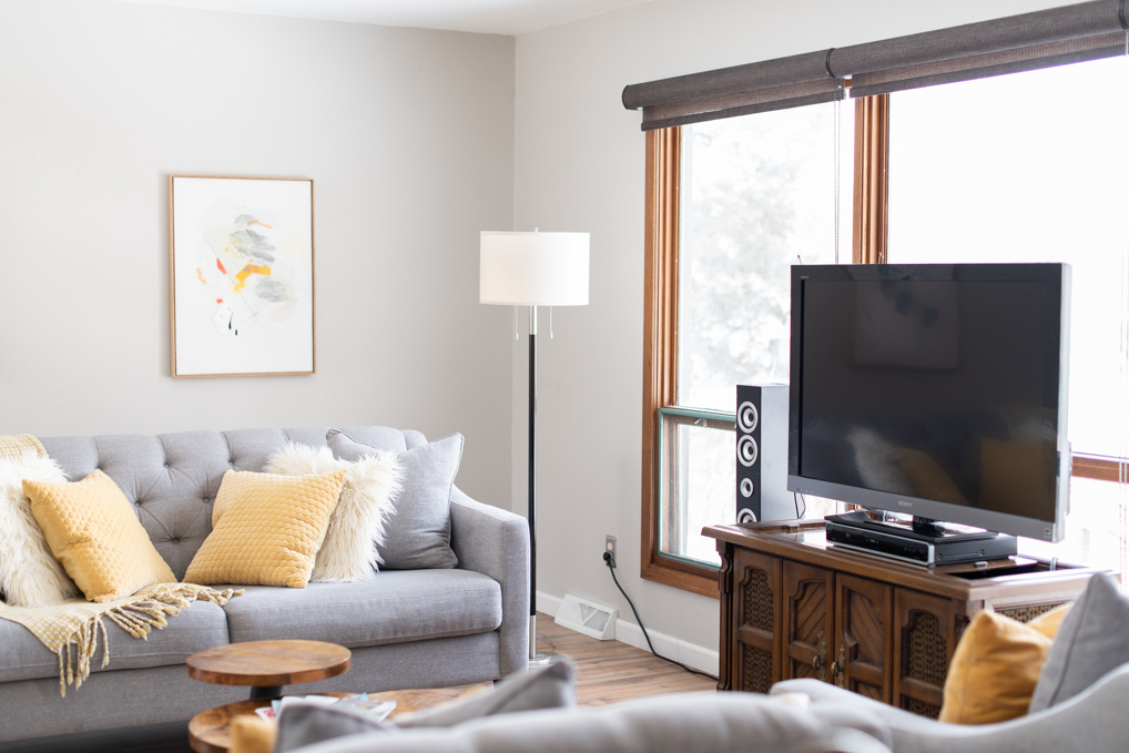 “We actually took out the wall that separated the kitchen and living room, and we really like how much light there is now,” she said. “I like to keep things simple, which is why I picked gray and white with yellow as the accent color. Having a simple base allows me to switch out the color when I get bored with it.”
