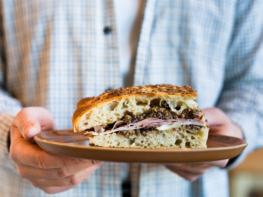 Gigante white bean, peppers, arugula, provolone, balsamic-soaked and sun-dried tomatoes on focaccia.